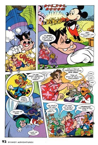 Creo que fue el año de mis últimas colaboraciones para Jaime Díaz, encargadas por Guillermo, su hijo, ya desde Estados Unidos (láminas de Scooby Doo para Look and Find, un episodio de los Mighty Ducks para Disney Adventures, algú libro ilustrado...), ya que él también había partido para Los Ángeles. Nada quedaba del estudio que había albergado a decenas de dibujantes unos años atrás. ¡Como para escribir un tango! Pero todavía seguían publicándose en la revista Disney Adventures, historietas hechas años antes, como ésta del consabido Bonkers, con guión de J. Enyart, en la que pude dibujar a muchos personajes del universo disneyano al mismo tiempo. Pronto, sólo dibujaría patos, patos... ¡y más patos!